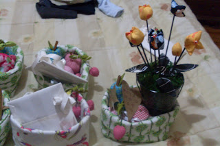 This year I've decided to offer our family a box made with fabric that contained fruit and other surprises like liquor, small purses and to the grandparents pictures of their grandchildren. I caught everybody by surprise and it was a nice surprise.